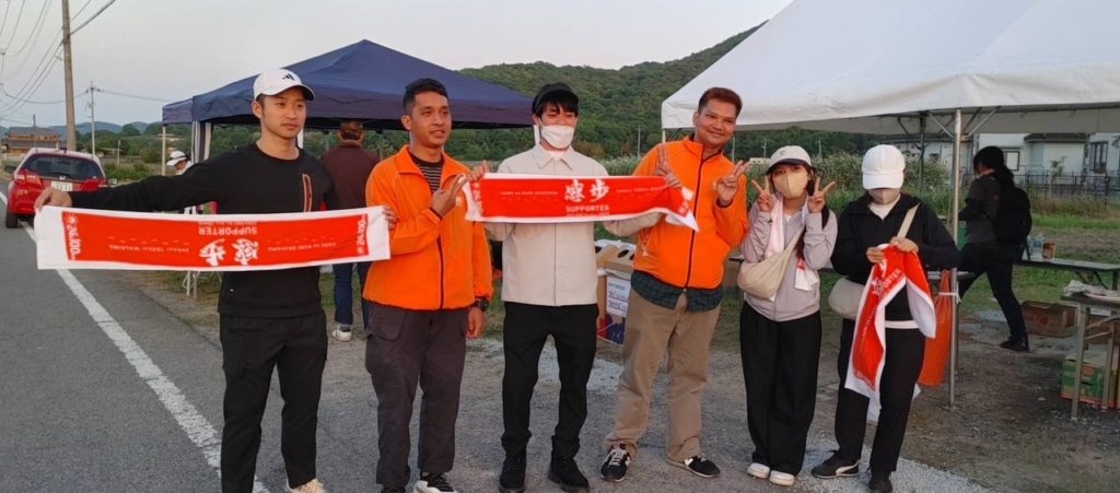 今年の100キロウォーキング大会にボランティアとして参加しました。ボランティアは故郷を離れて日本に留学して初めて。とても興味深い経験になりました。多くの人々に会い、疲れていても、強い意志ですべてを乗り越えてゴールするウォーカーたちの忍耐力と粘り強さに感心しました。天気は残念ながら正午にはかなり暑くなり過ぎましたが、気の強い選手はこの日も元気に課題をやり遂げようとしていました。未来には、アスリートのような回復力を養うために、このような100キロウォーキング大会にも参加したいと思っています。
